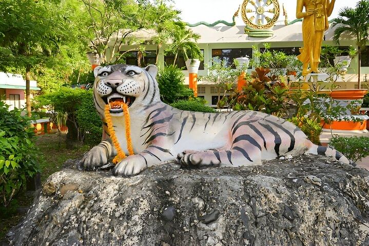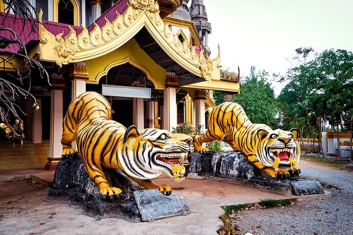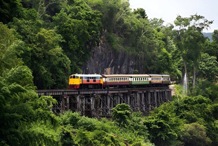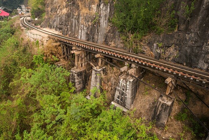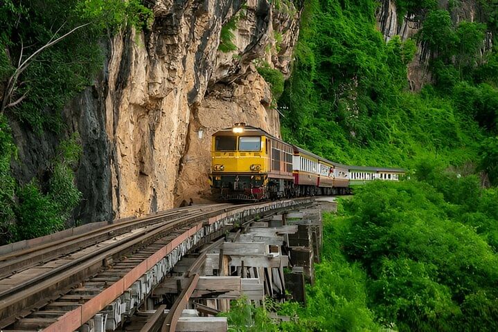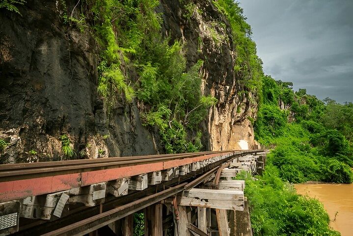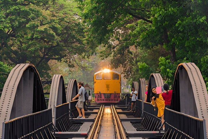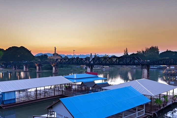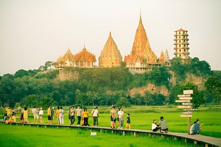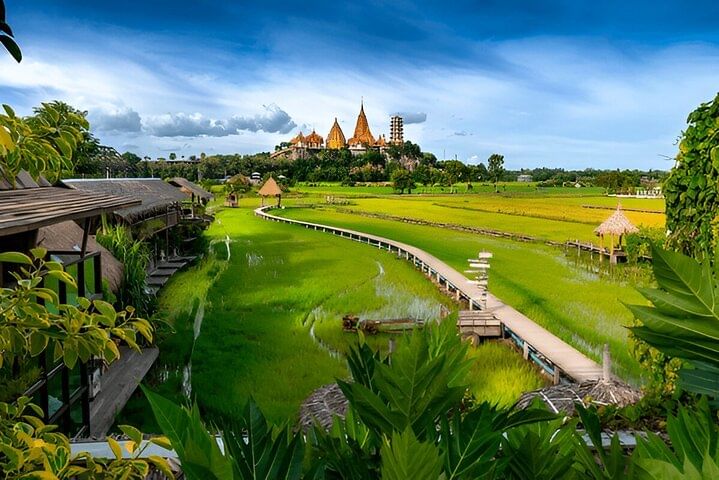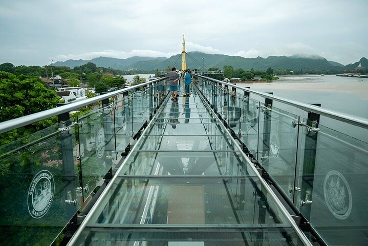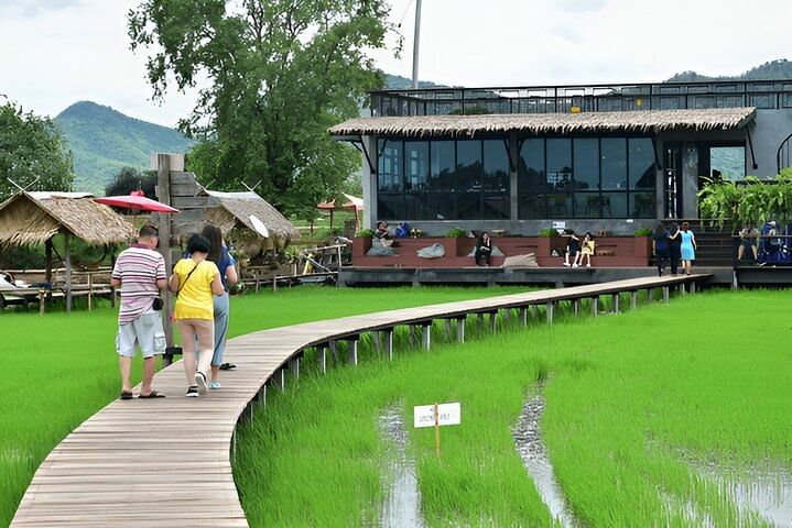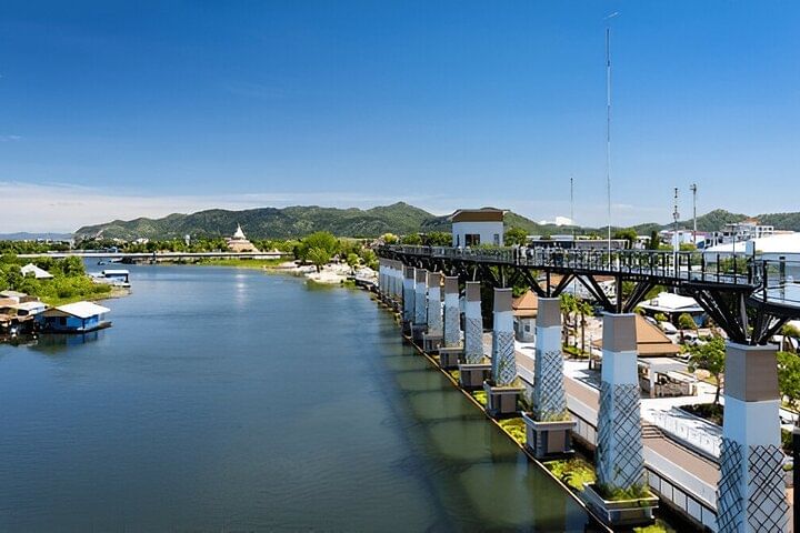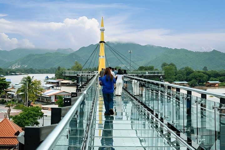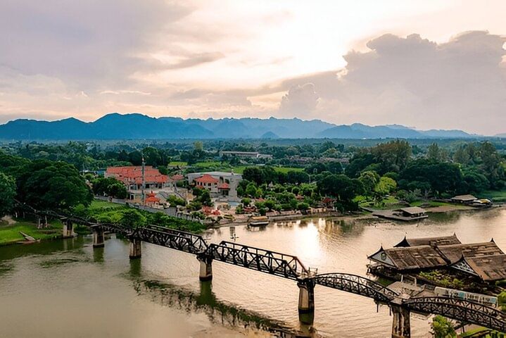 Explore the best of Kanchanaburi with a visit to Wat Tham Suea, a hilltop temple featuring a giant golden Buddha and scenic rice field views. Enjoy coffee at MEENA Cafe, set against a backdrop of lush paddies and temple vistas. Walk the Tham Krasae Death Railway Bridge, a WWII-era cliffside structure steeped in history. Cross the iconic Bridge over the River Kwai, a symbol of wartime resilience made famous by film. Finally, experience the Skywalk Kanchanaburi City, a glass walkway offering panoramic views of the river junction and natural beauty surrounding this peaceful town.